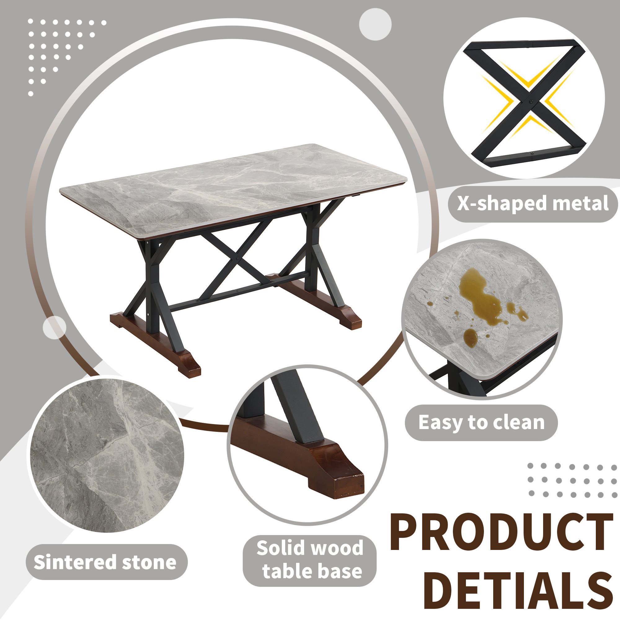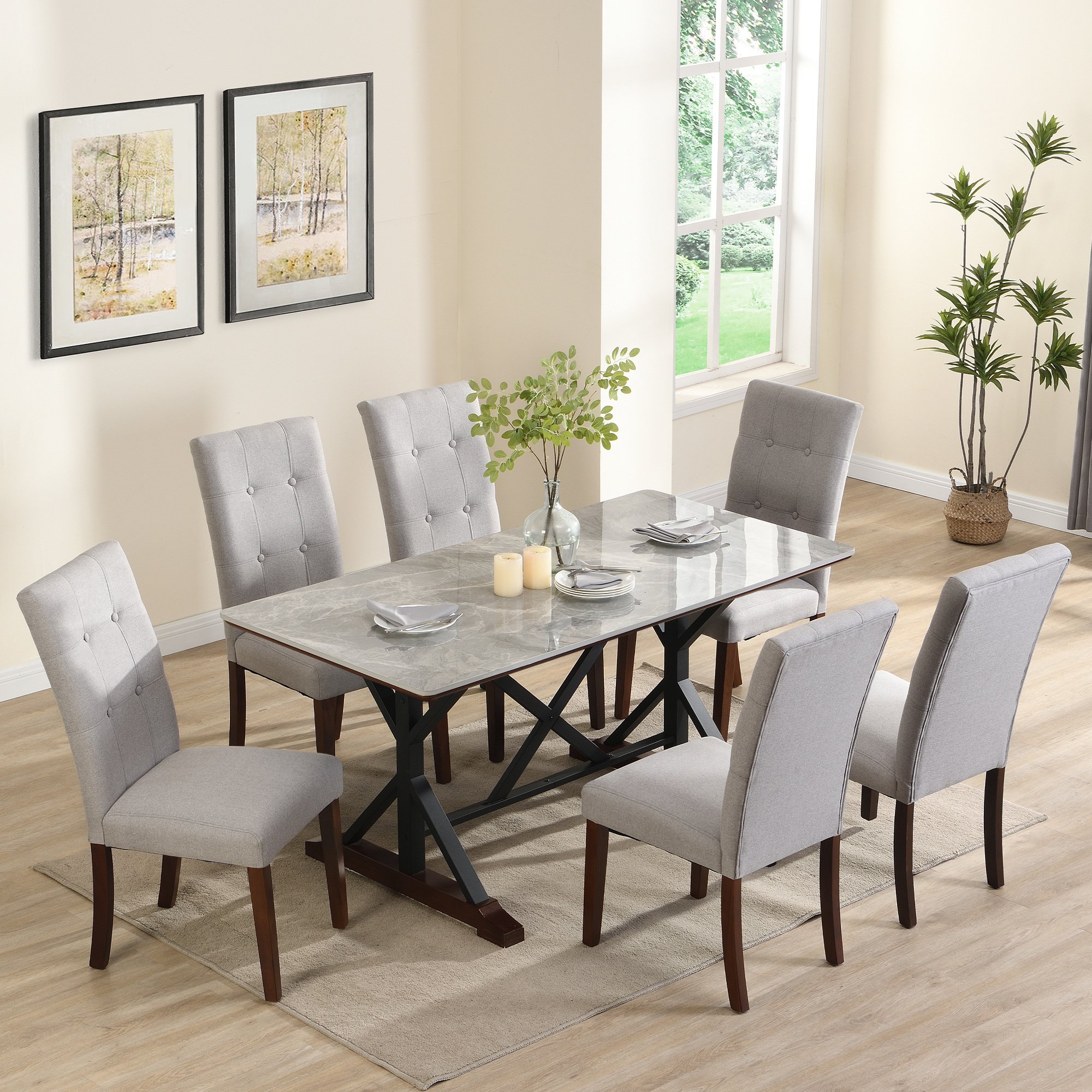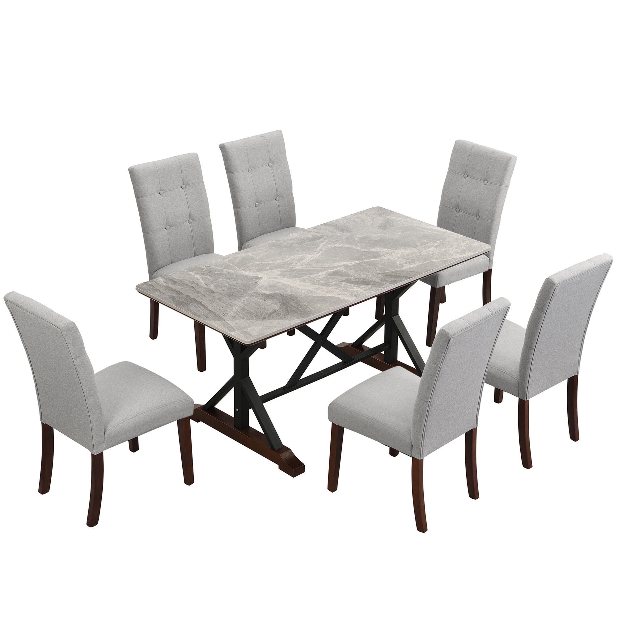 > 7-piece Modern Dining Table Set, Gray Sintered Stone Dining Table with 6 Tufted Upholstered Chairs, 63-inch Rectangle Dining Table for Dining Room