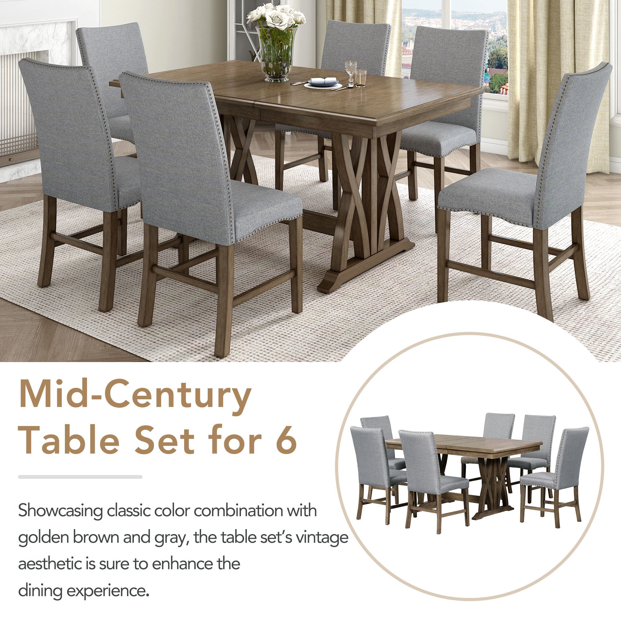 [Mid-Century Table Set for 6] The dining table's retro trestle base and cross legs evoke a sense of elegance and charm that is matched only by its functionality. It provides ample support and stability, ensuring that the table can withstand heavy usage and still look great.Showcasing classic color combination with golden brown and gray, the table set's vintage aesthetic is sure to enhance the dining experience and bring a touch of sophistication to any home.