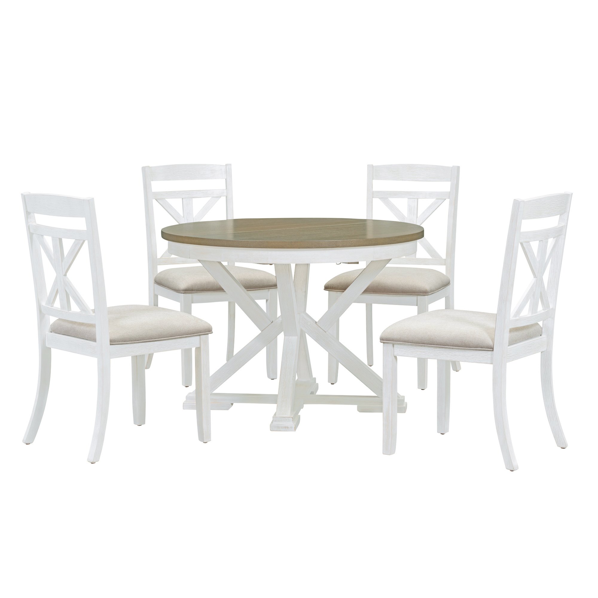 TREXM 5-Piece Retro Functional Dining Table Set Extendable Round Table and 4 Upholstered Chairs for Dining Room and Living Room (Brown+Antique White)