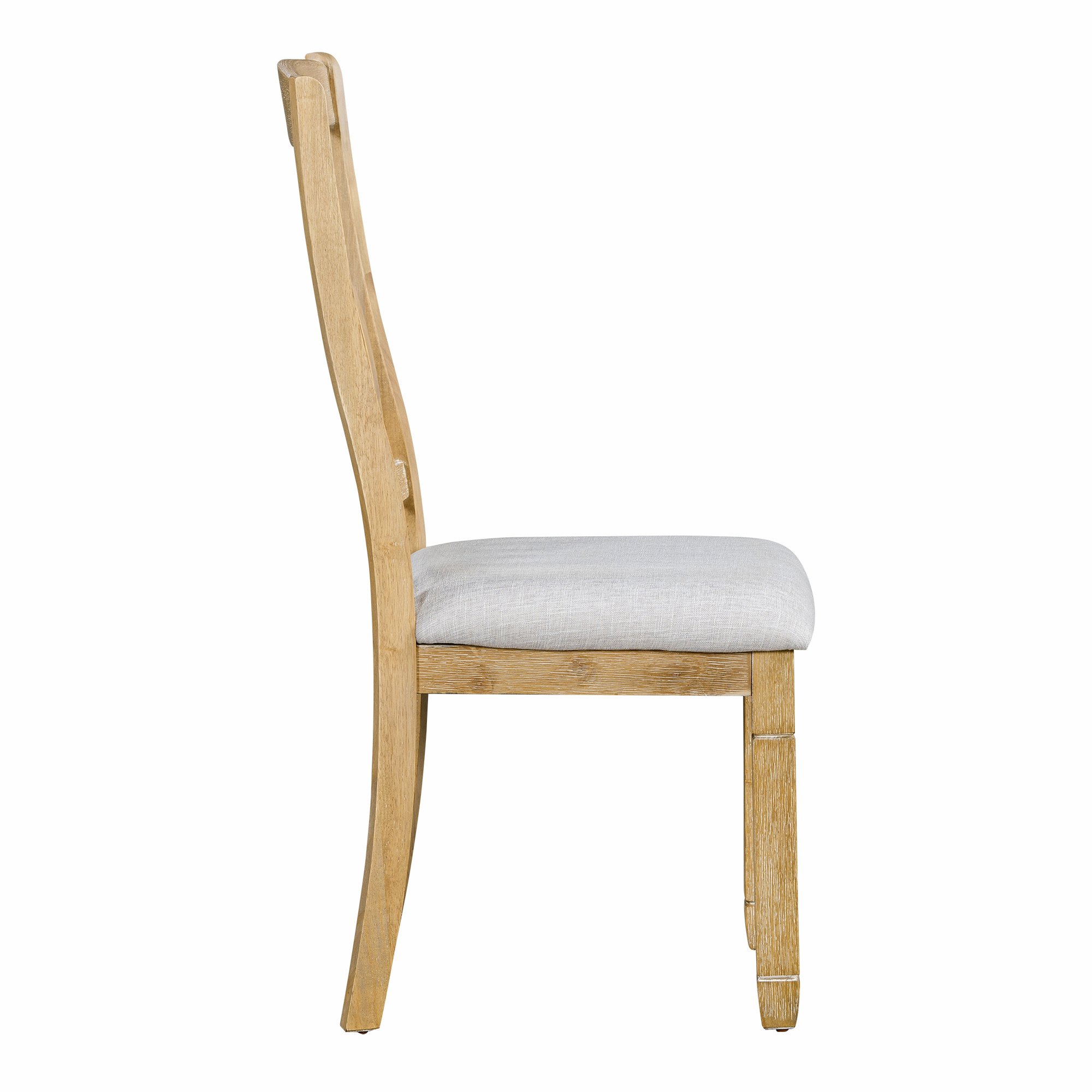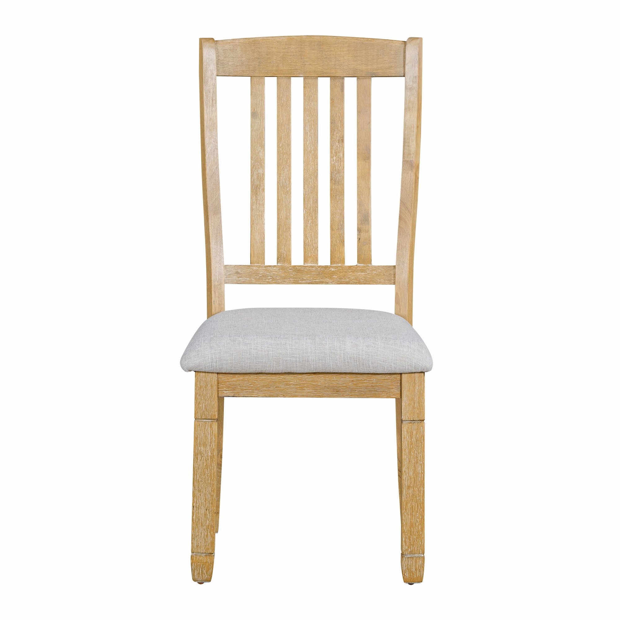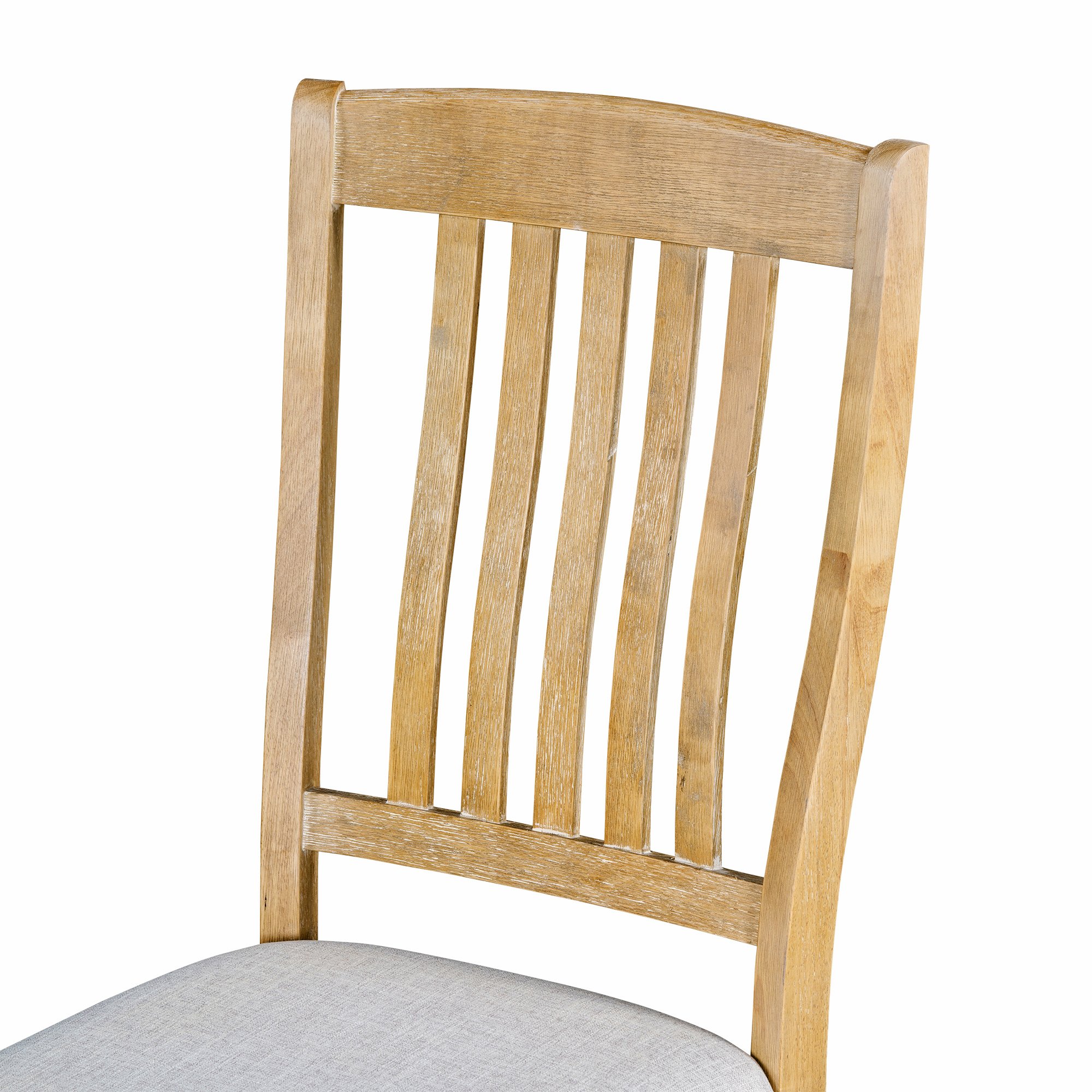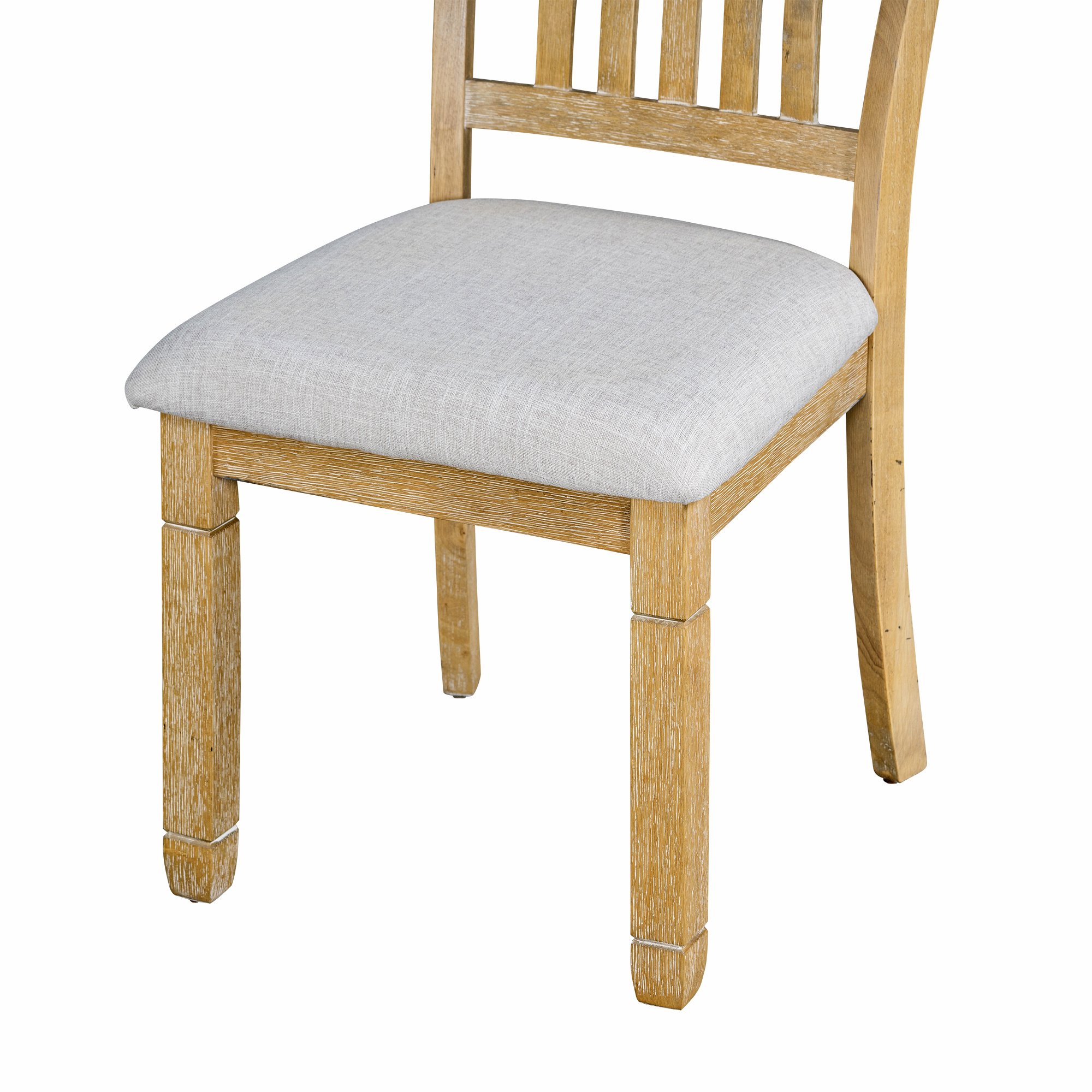 The natural wood wash and grey finish add a distinctly rustic look that easily updates any household. The table features four drawers with antiqued bronze-tone handles, the wood grain and metal texture complementing each other perfectly. Tapered legs of this dining set feature both a retro flair and a sturdy foundation. Slat backrests of chair sets are in line with ergonomic design, thus bringing superb comfort.