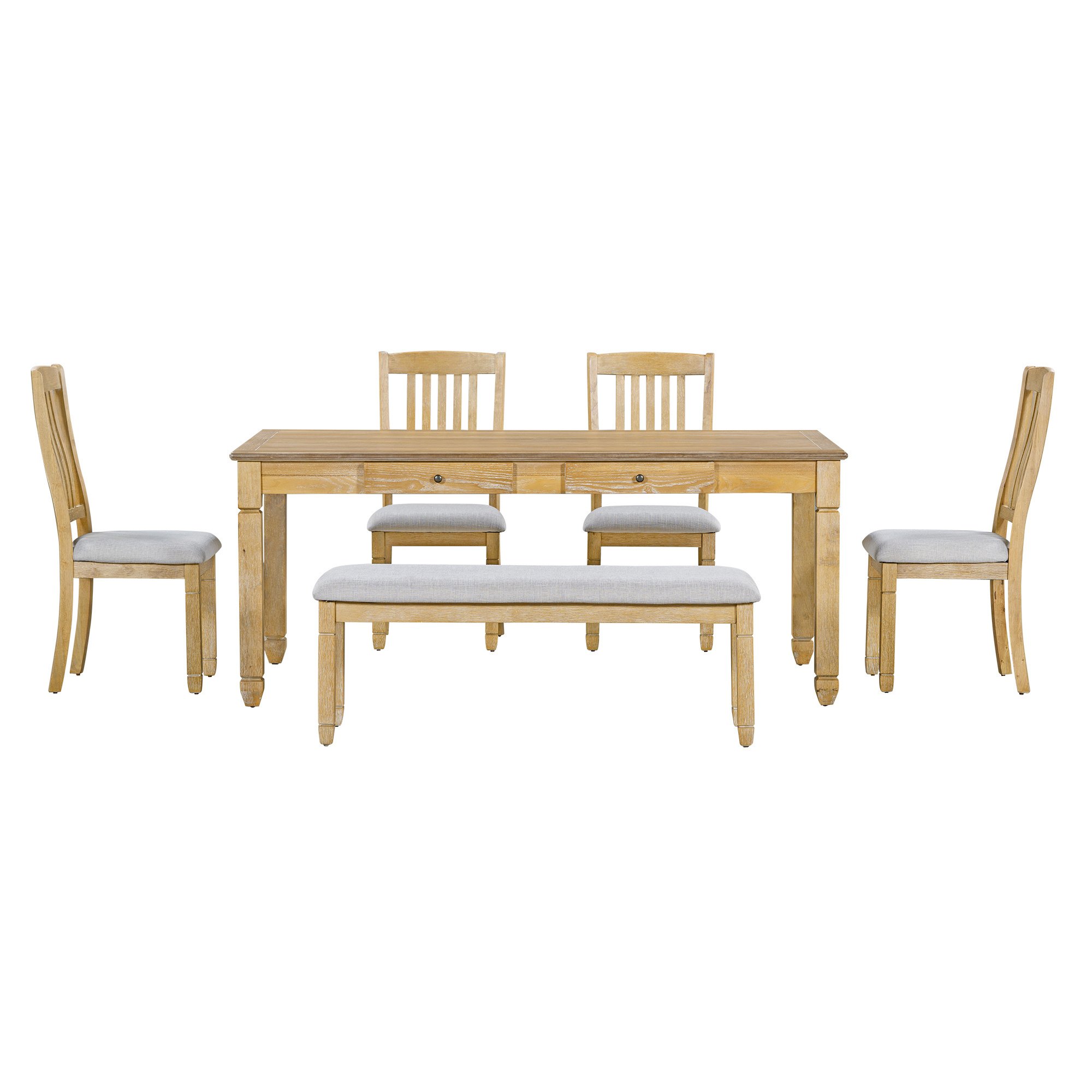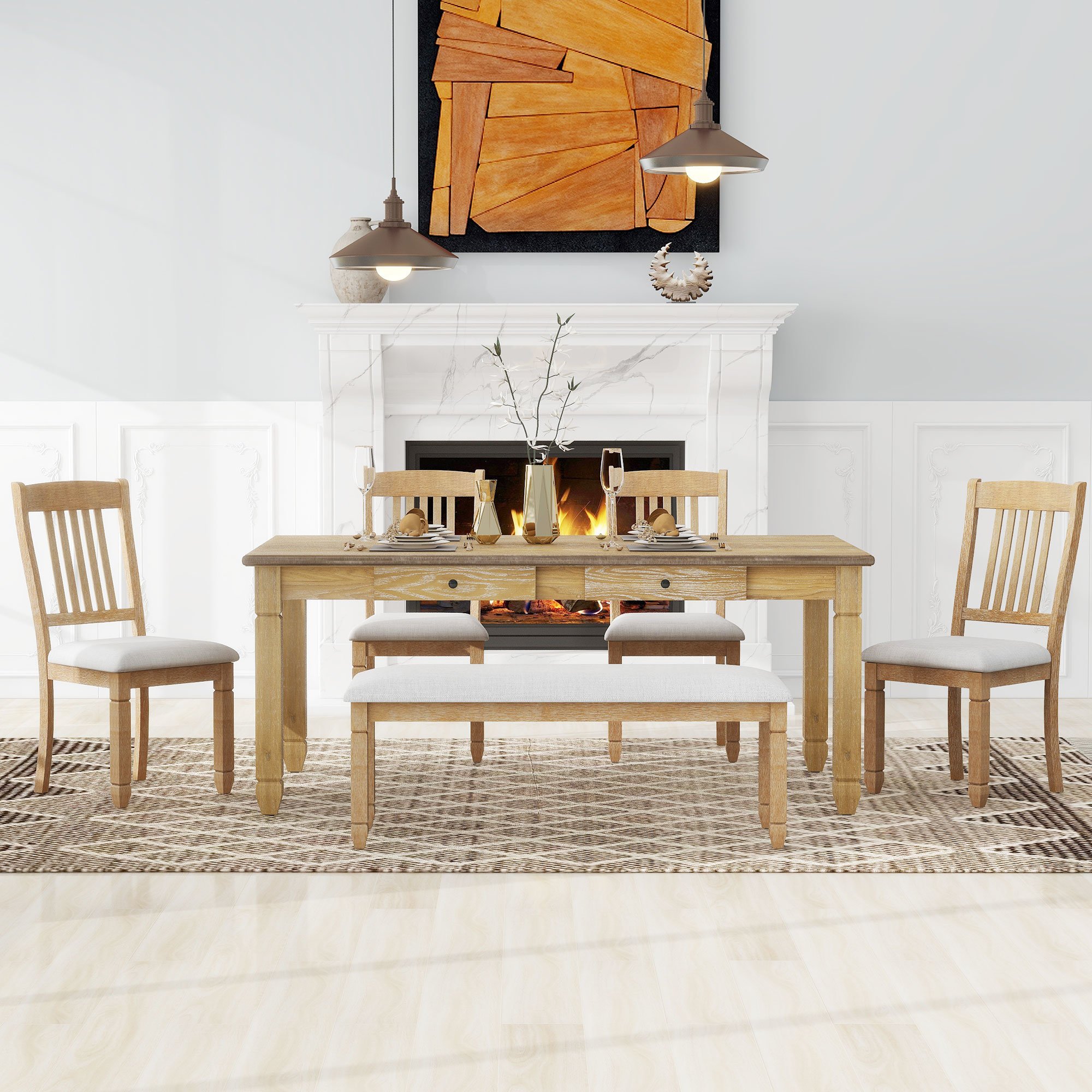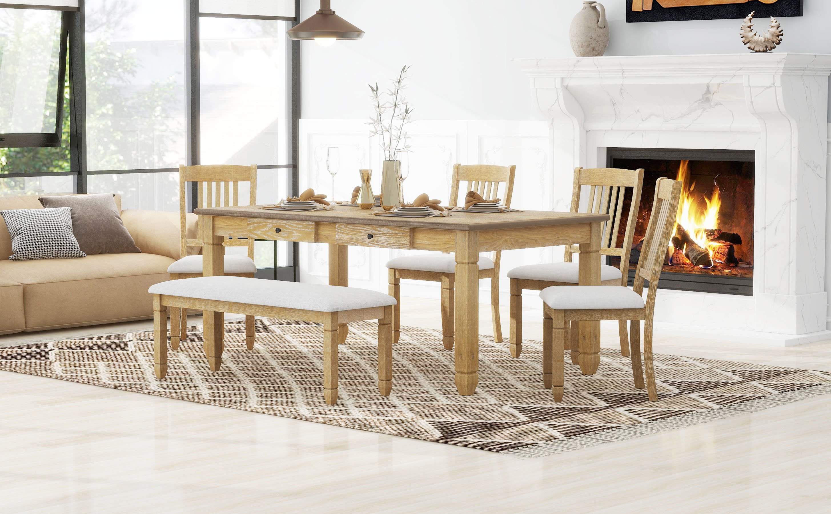 Retro StyleThis 6-piece retro-style dining table set will redefine your dining space with its elegant appearance. Its timeworn planked ash top creates a unique two-tone contrast, while tapered legs feature a sturdy foundation. The natural wood wash and grey finish add a distinctly rustic look that easily updates any household. The table features four drawers with antiqued bronze-tone handles, the wood grain and metal texture complementing each other perfectly.