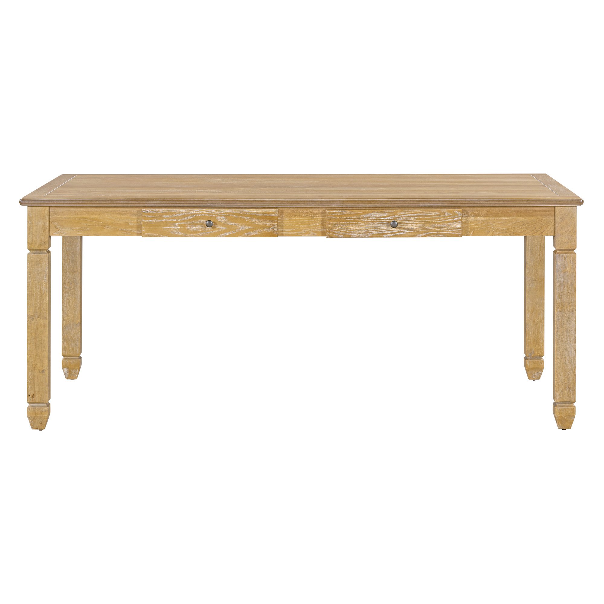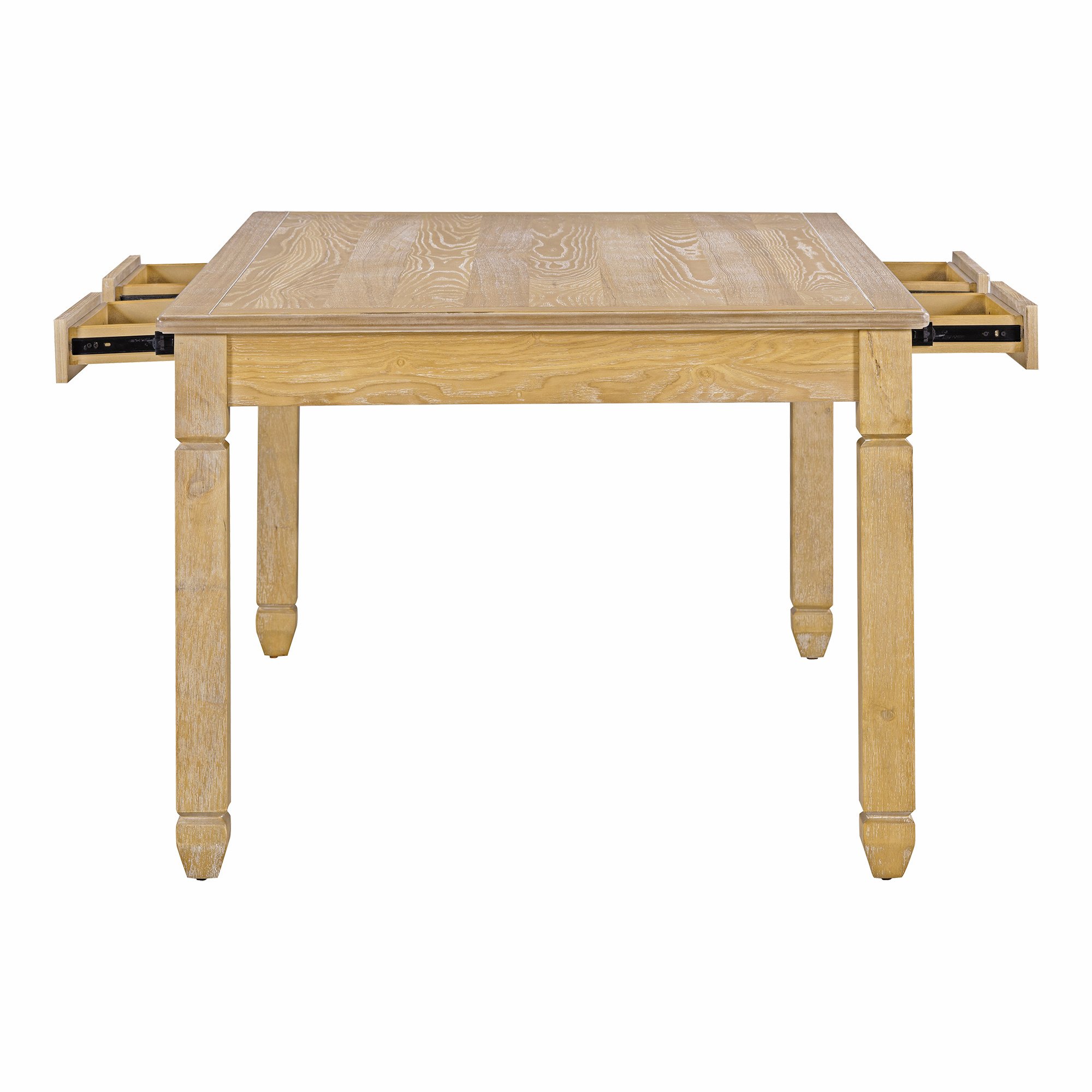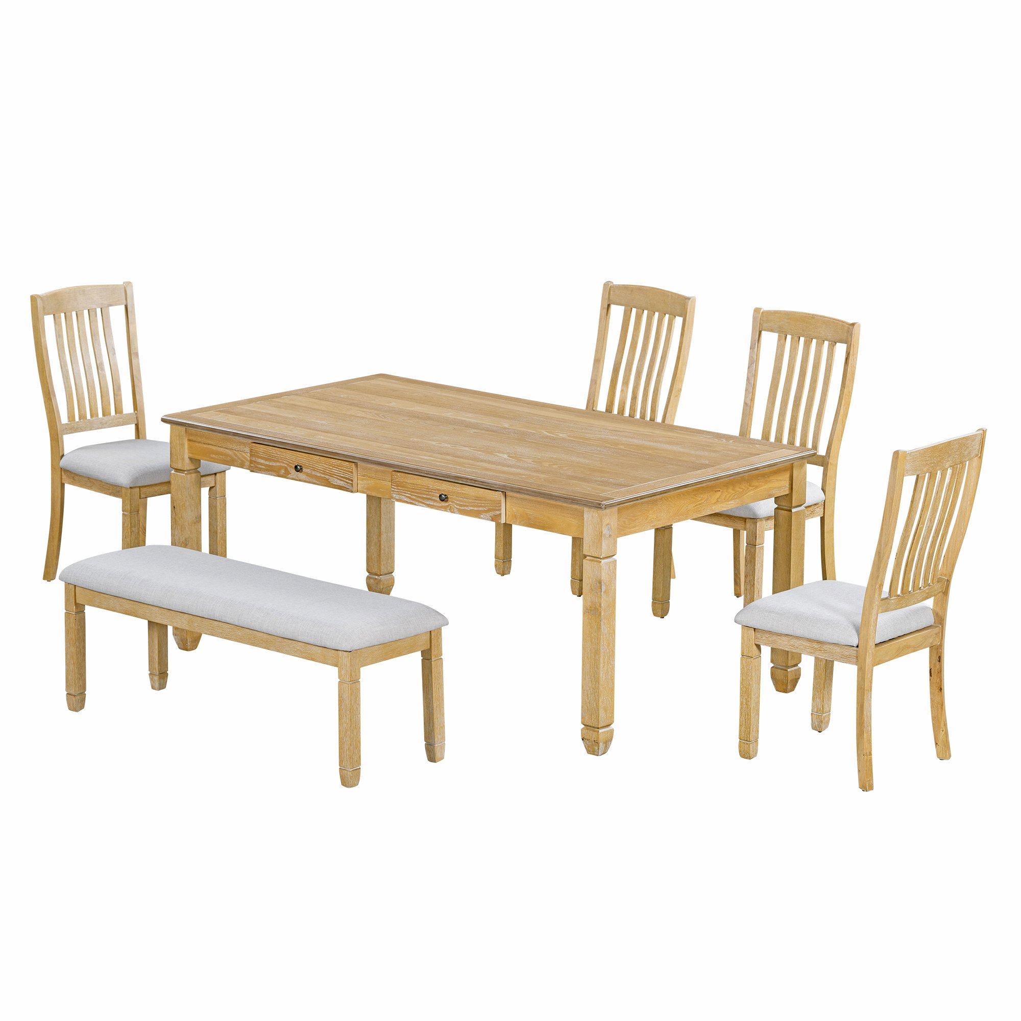 Retro StyleThis 6-piece retro-style dining table set will redefine your dining space with its elegant appearance. Its timeworn planked ash top creates a unique two-tone contrast, while tapered legs feature a sturdy foundation. The natural wood wash and grey finish add a distinctly rustic look that easily updates any household. The table features four drawers with antiqued bronze-tone handles, the wood grain and metal texture complementing each other perfectly.
